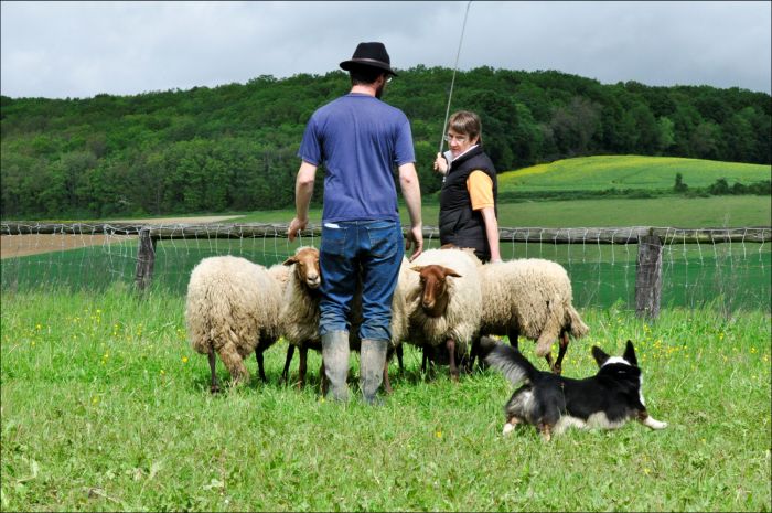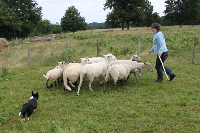 Mensch und Hund müssen aufmerksam folgen; Evelyne mit Guiny's Kindern Furlan und Falster im Sommer 2012 beim Hütetraining in Frankreich |