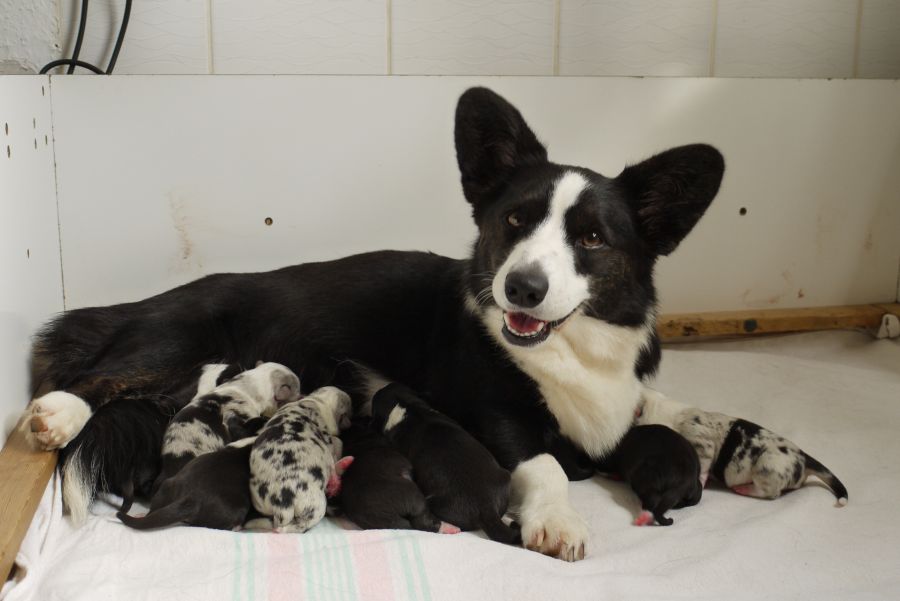 ![]() Die 10 neugeborenen O-Welpen wohlbehütet mit Mutter Inis |