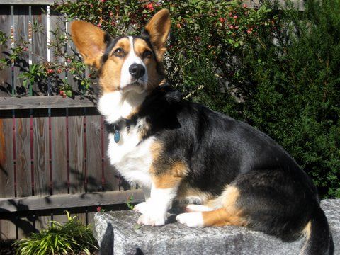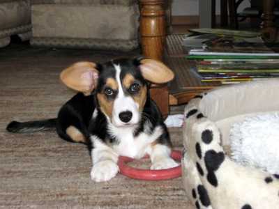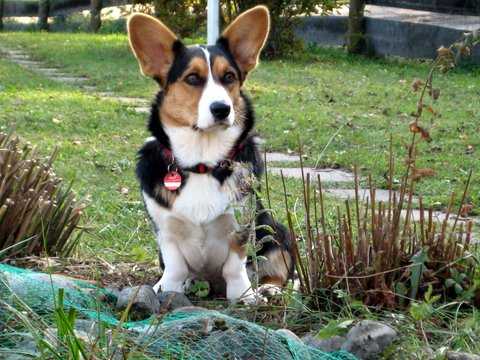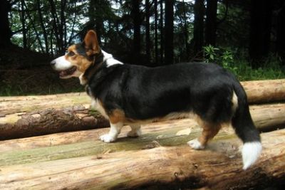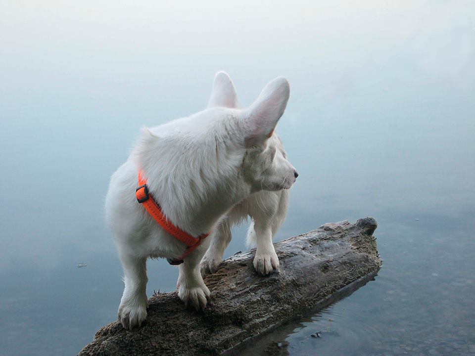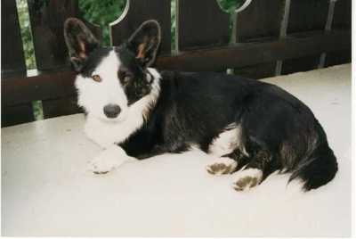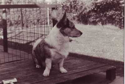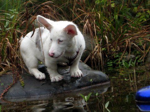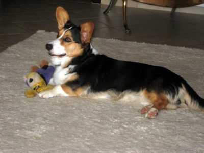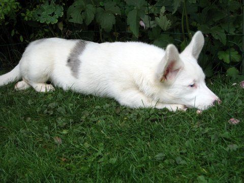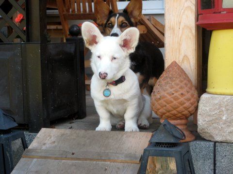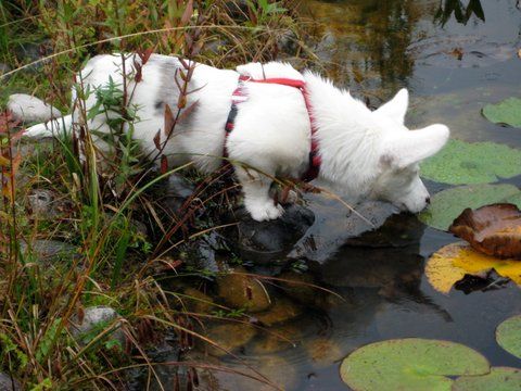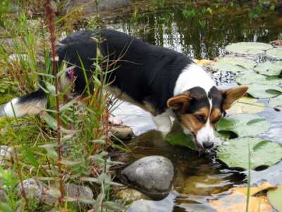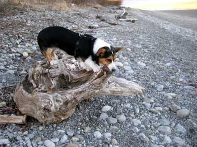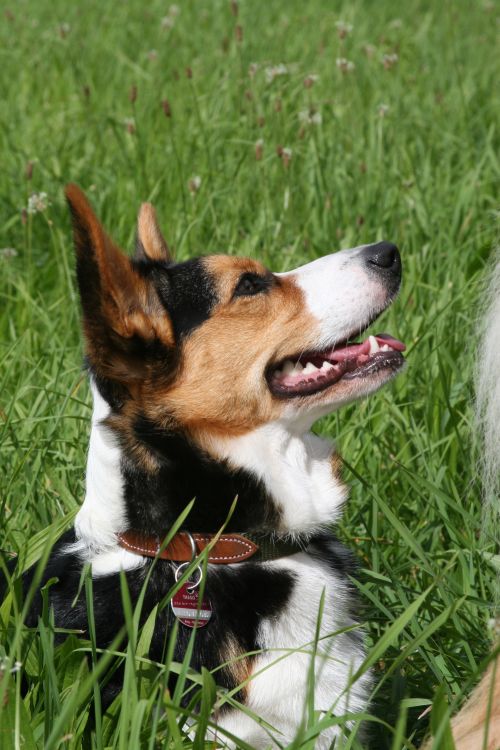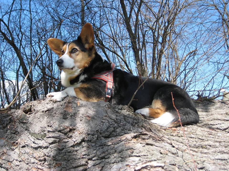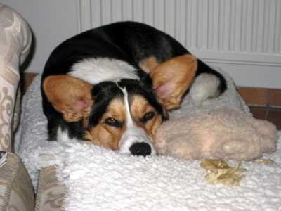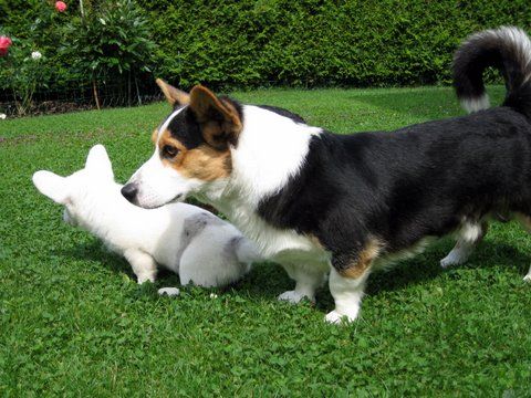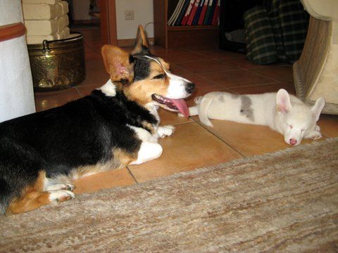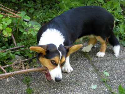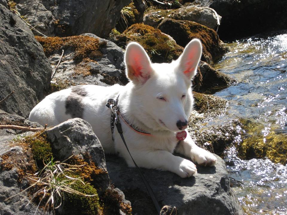 Glücklicher als über die schöne Landschaft ist Gwenny bei ihrer Ankunft im Frühjahr 2009 darüber, dass bereits der alte Cardigan Huck hier zu Hause ist. So ein alter Herr bietet doch viel Geborgenheit. Und dass Huck mit seinen 16 Jahren nicht mehr zu wilden Spielereien überredet werden möchte, hat Gwenny schnell verstanden. |