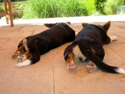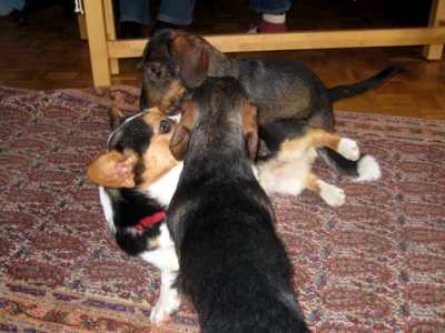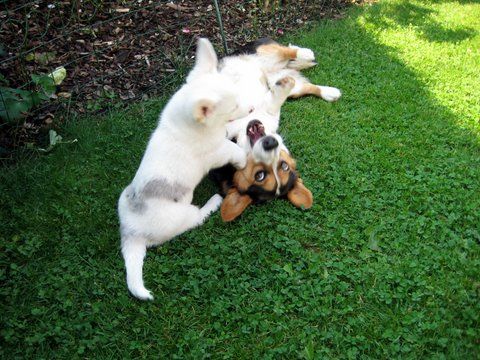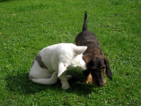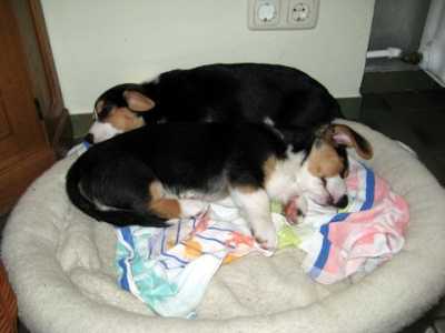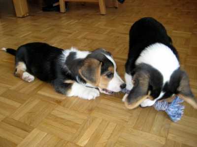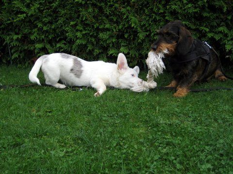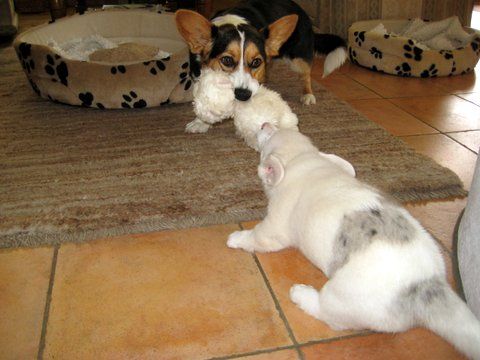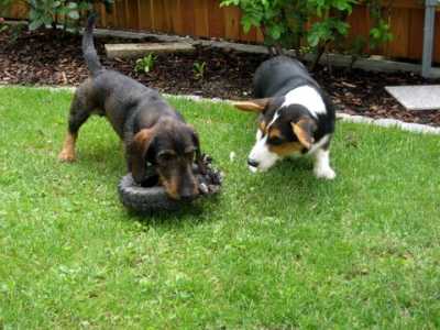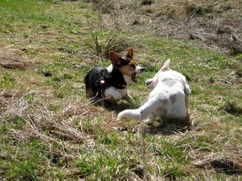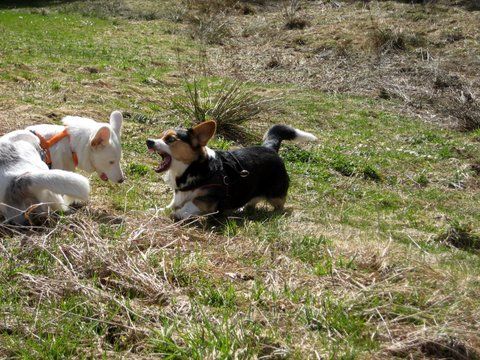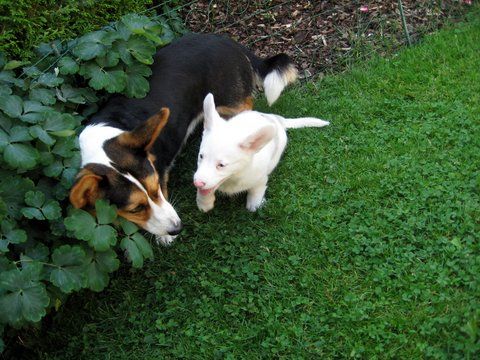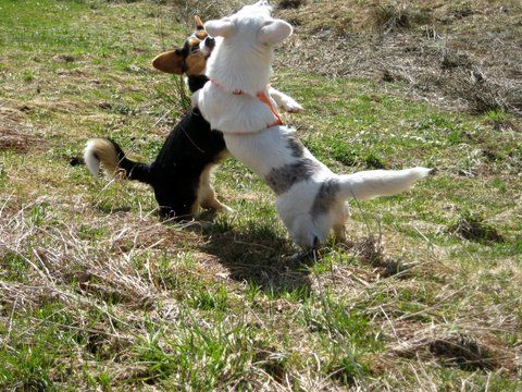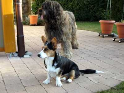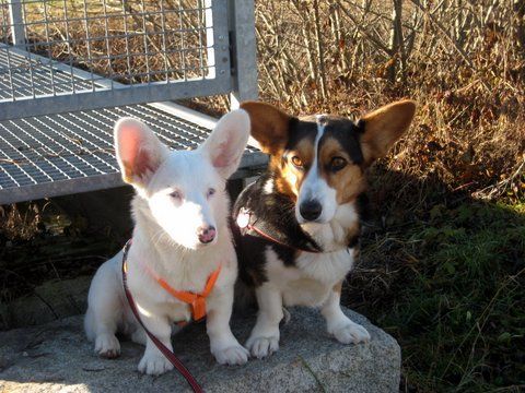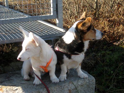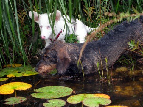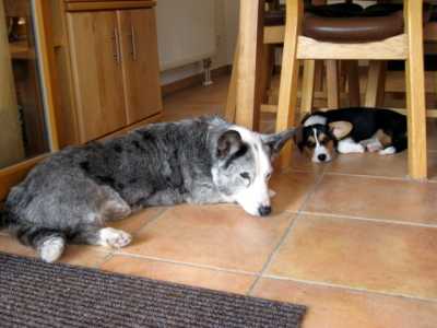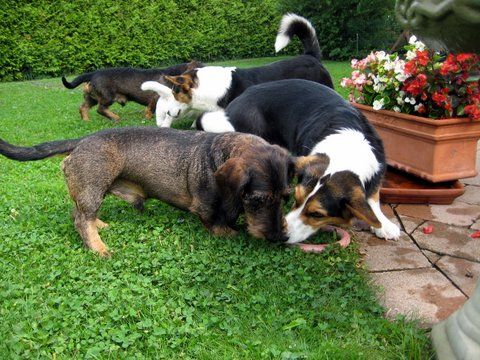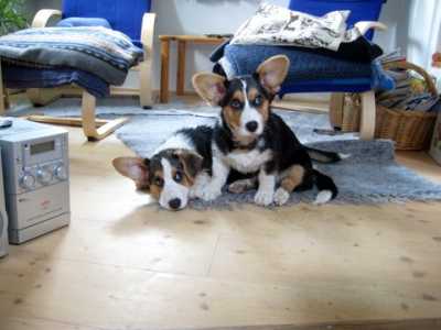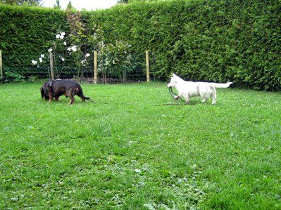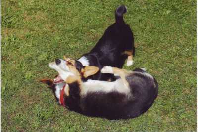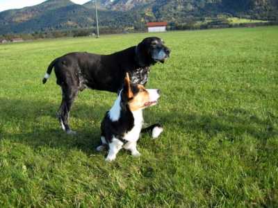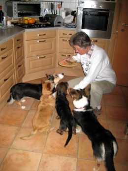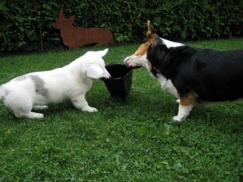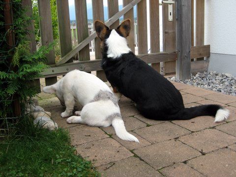 Gwenny freut sich über die regelmäßigen Treffen mit ihrem Wurfbruder Merlin (Joy Transfer Inwyn). Merlin wohnt gar nicht weit entfernt in Murnau in Oberbayern. Einmal in der Woche treffen sie sich mit ihren Frauchen und anderen Freundinnen und deren Hunden. Alle sind gut beschäftigt, die Frauen mit Frühstück, die Hunde mit Spielen. Wenn dann noch eine kleine Wanderung folgt, sind am Ende des Tages alle erschöpft und höchstzufrieden. |