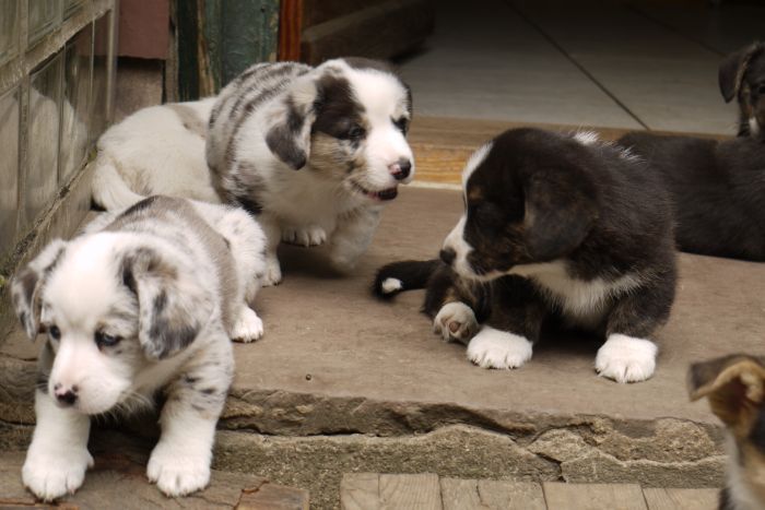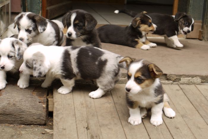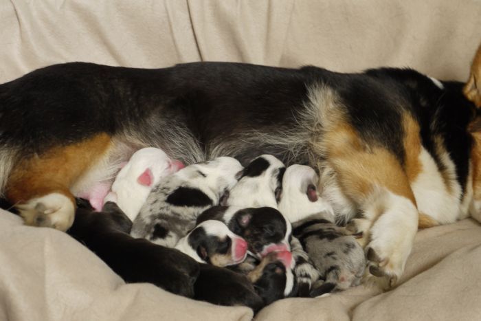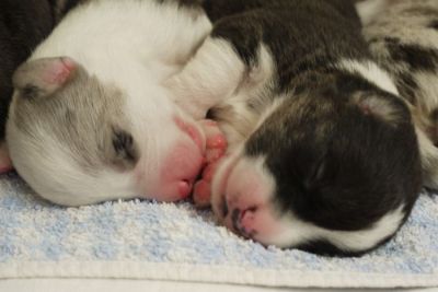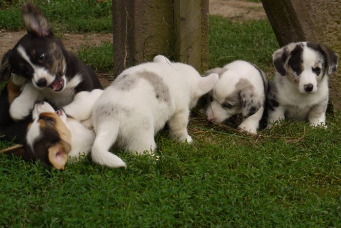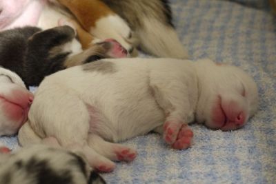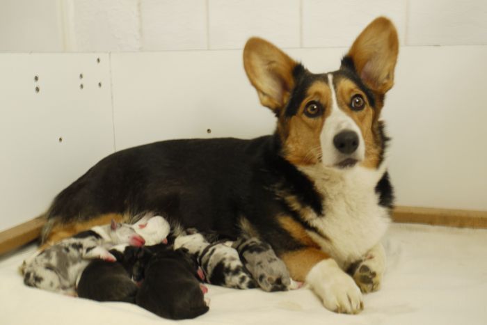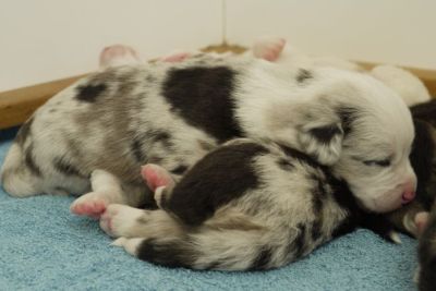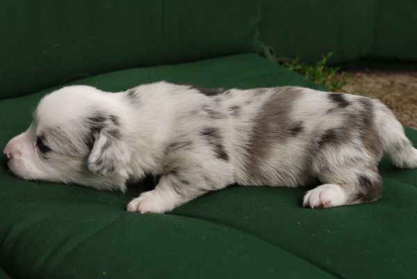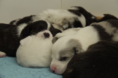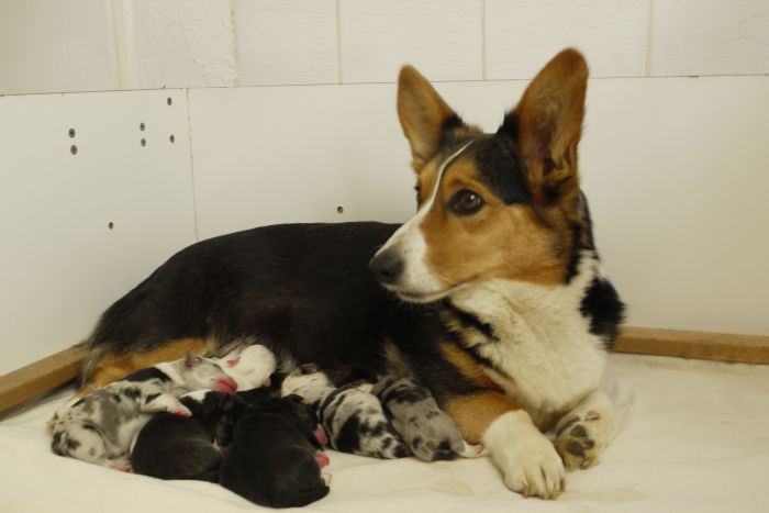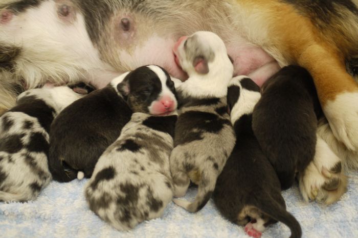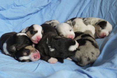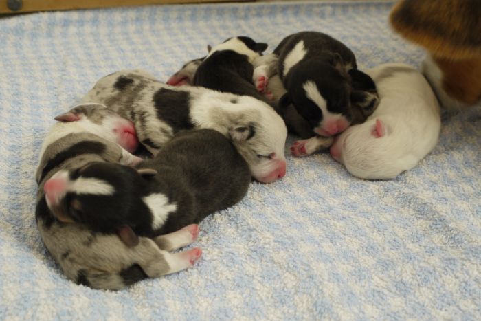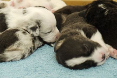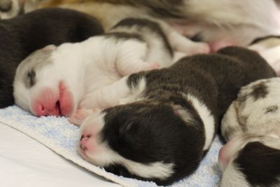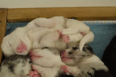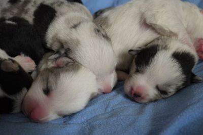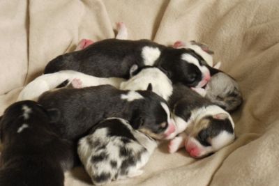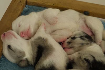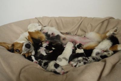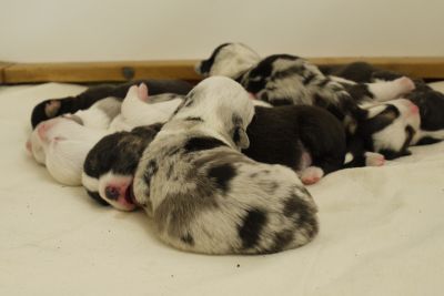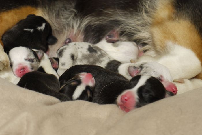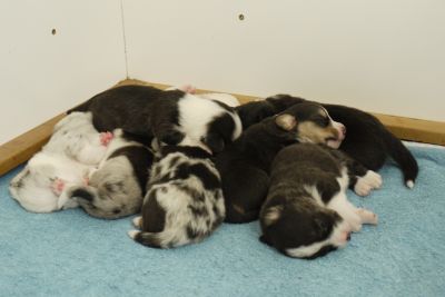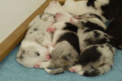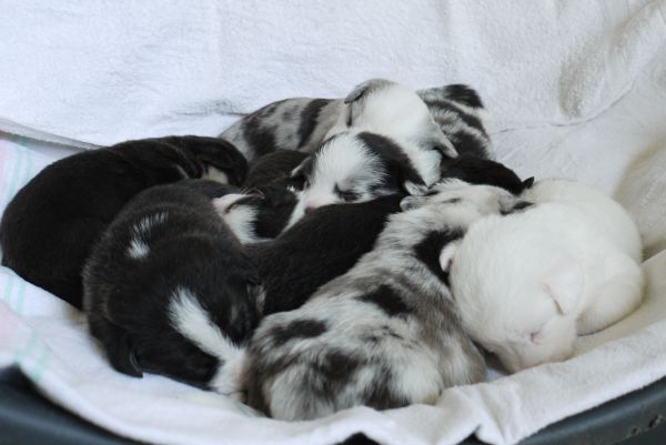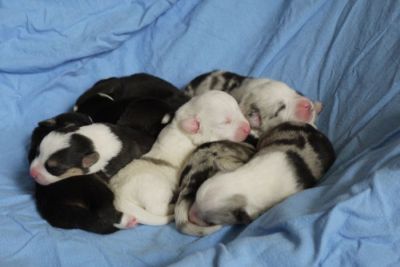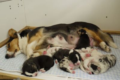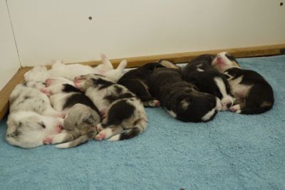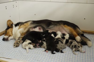 Joy Transfer Imogen "Ima" hat am Pfingstmontag, den 28. Mai 2012, ihre 8 Welpen (6 Rüden und 2 Hündinnen) ohne Probleme auf die Welt gebracht von dem schwedischen blue merle Rüden Ch.Blåtirans Fritjoff Frikadell "Frosten" (Besitzerin Angelika Ludwig) |