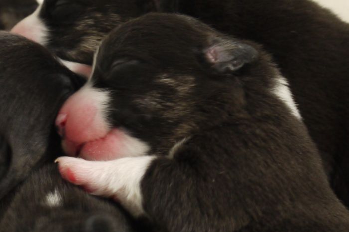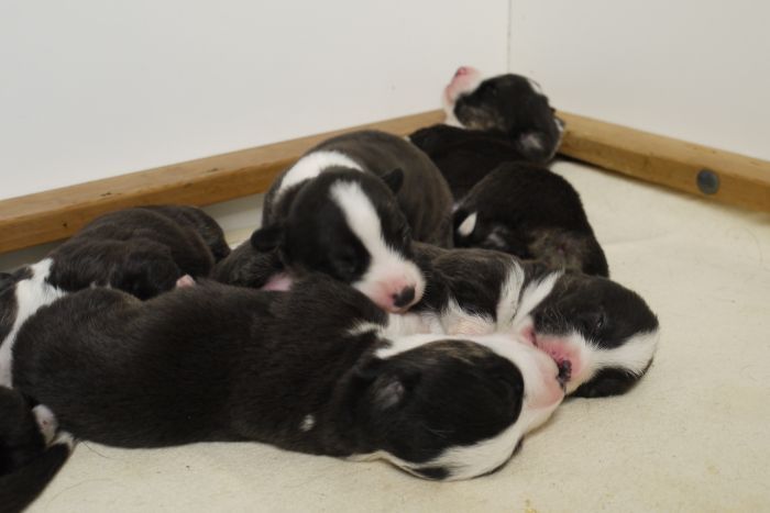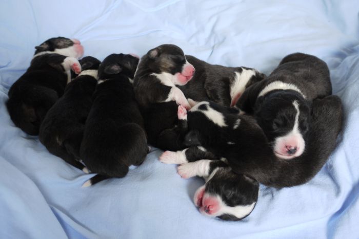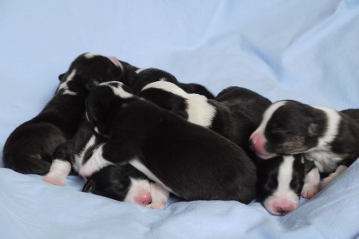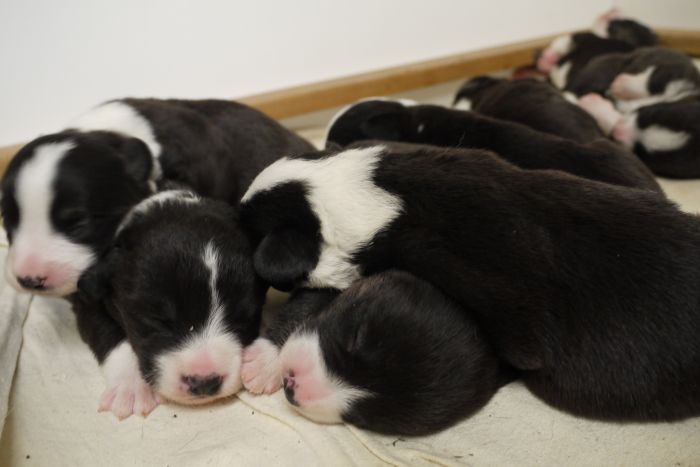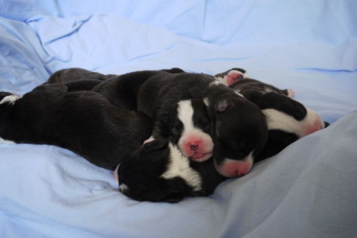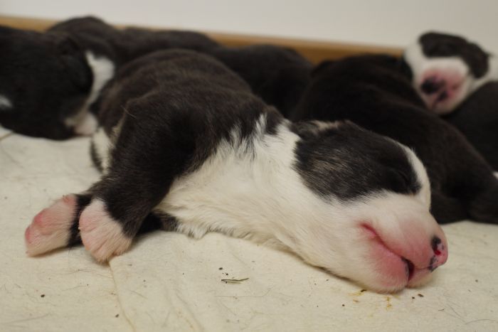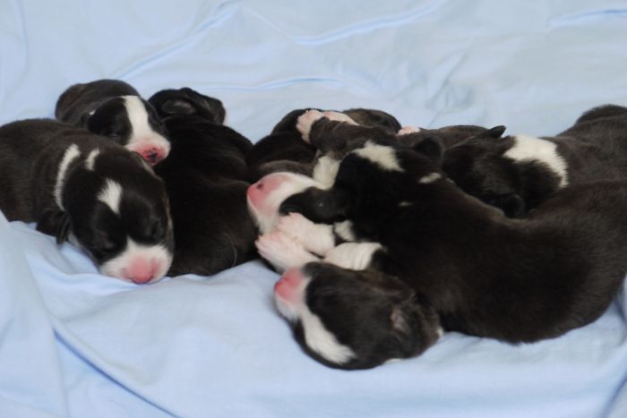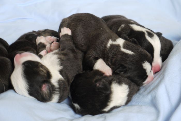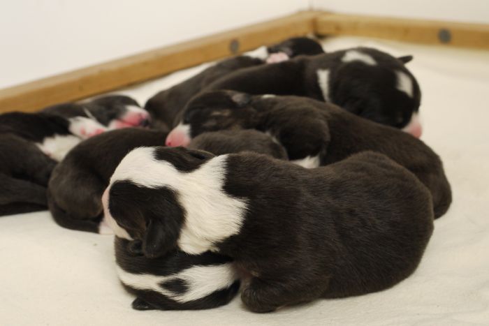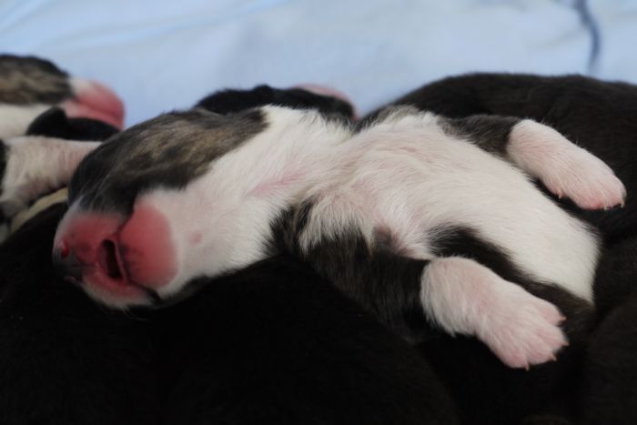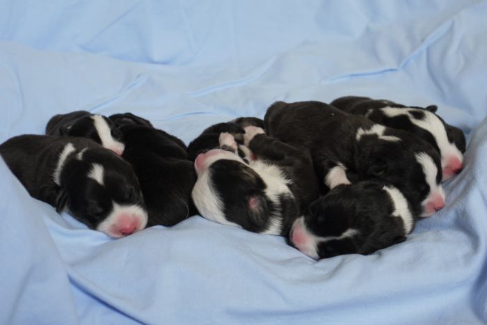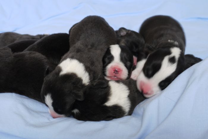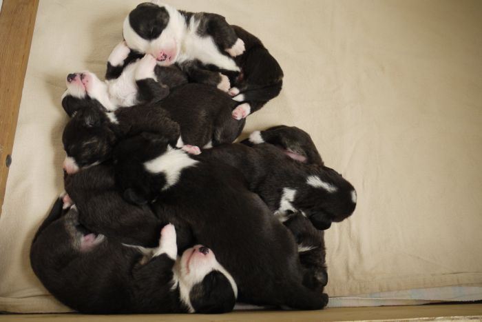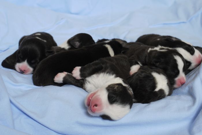 | 6 Tage alt sind die Welpen inzwischen. Nuckeln, kuscheln, schlafen und täglich an Gewicht zunehmen, mehr müssen sie noch nicht können. Und das machen sie sehr brav. |