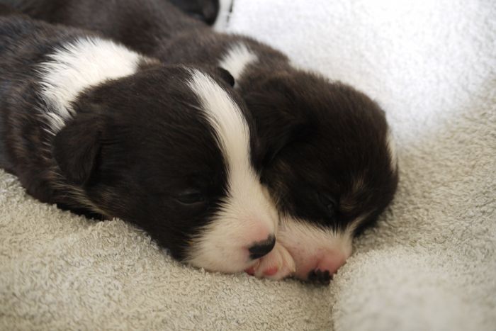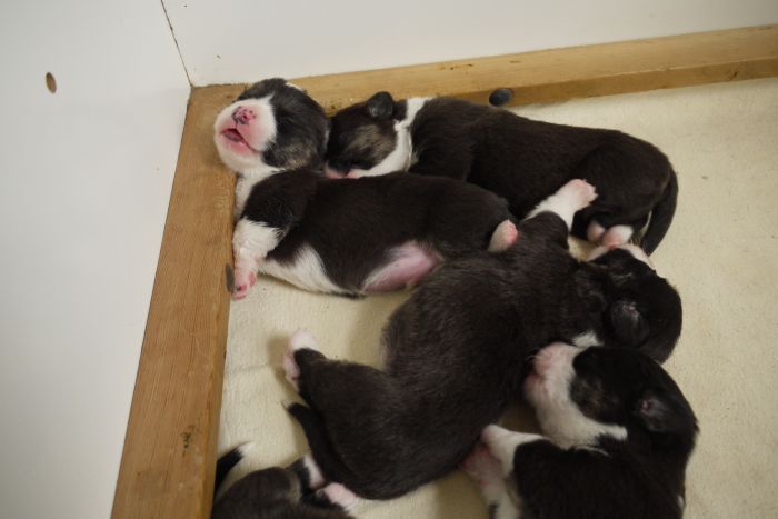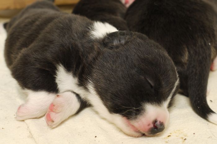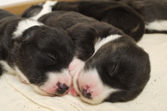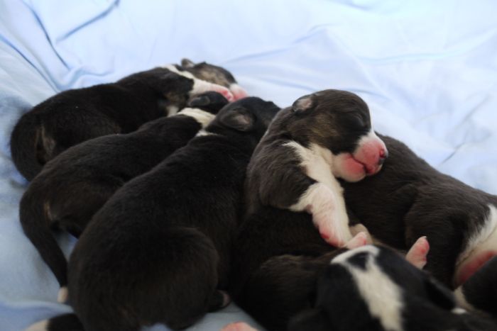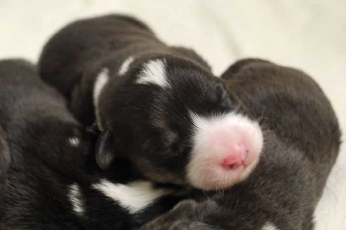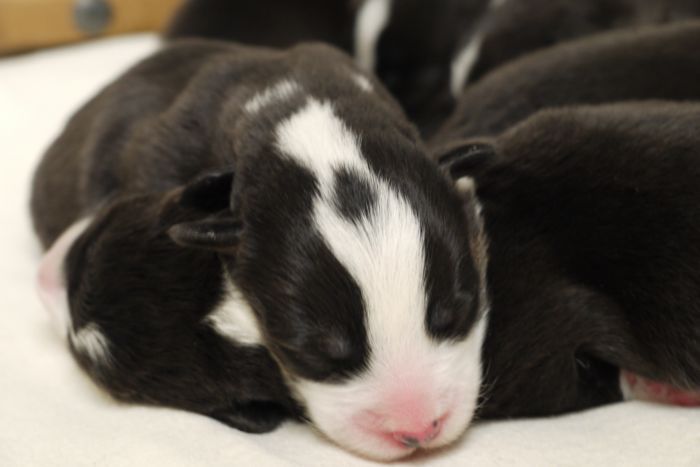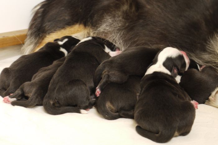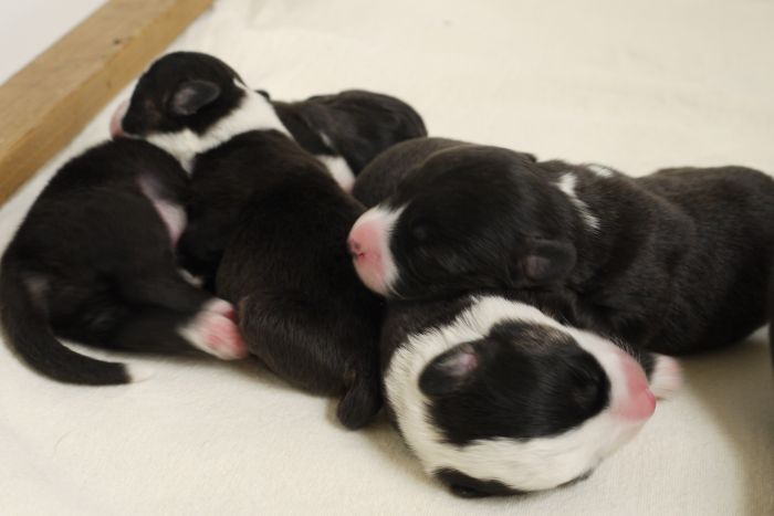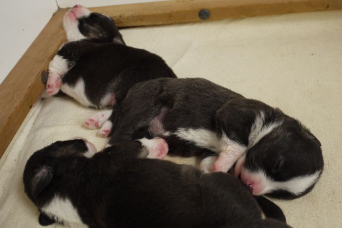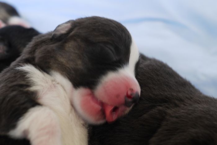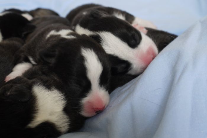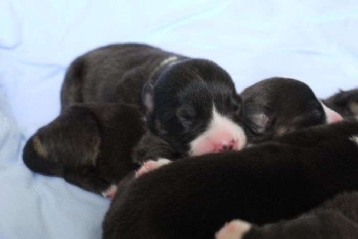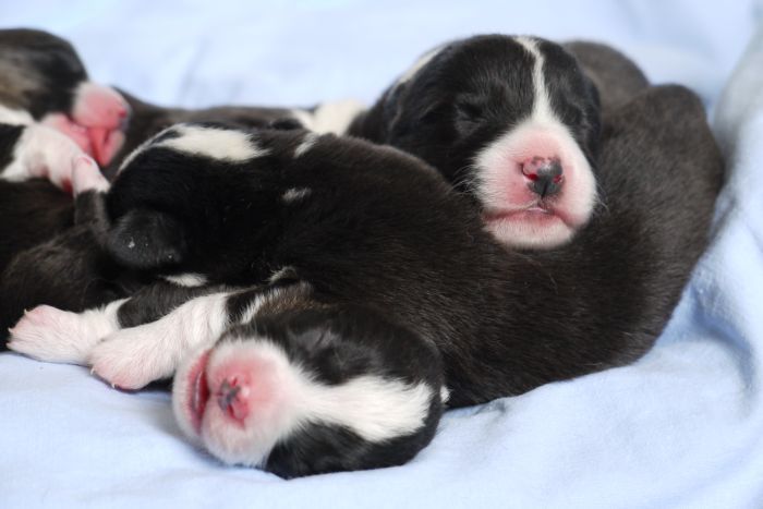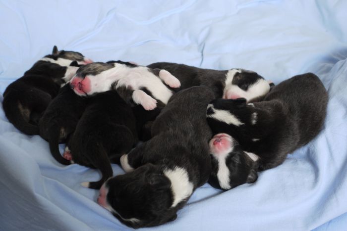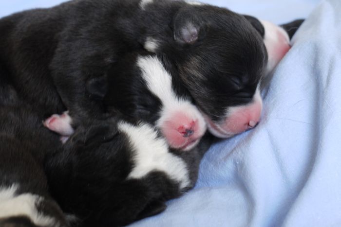 | 6 Tage alt sind die Welpen inzwischen. Nuckeln, kuscheln, schlafen und täglich an Gewicht zunehmen, mehr müssen sie noch nicht können. Und das machen sie sehr brav. |