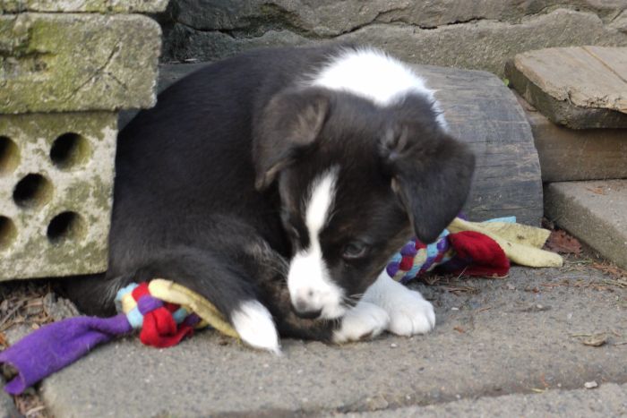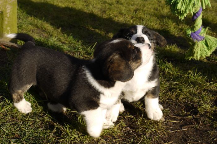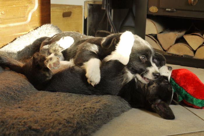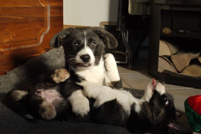 | 7 Wochen alt sind die Welpen auf diesen Fotos. Der gar nicht winterliche Dezember lädt zum ausgiebigen Spielen im Garten ein. |