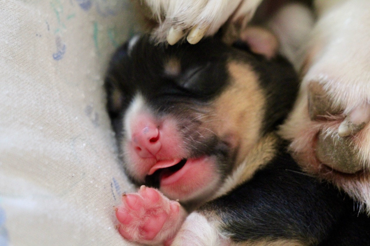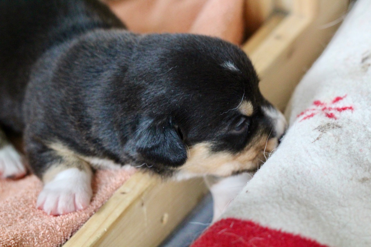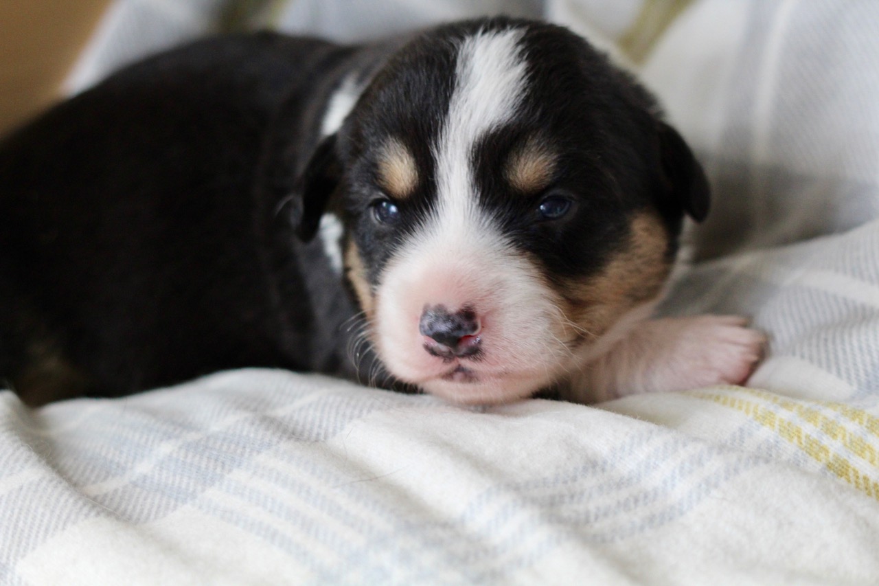 Als erster im Wurf hat dieser süße tricolour Rüde heute seine Augen geöffnet. |