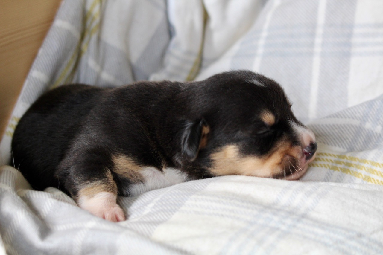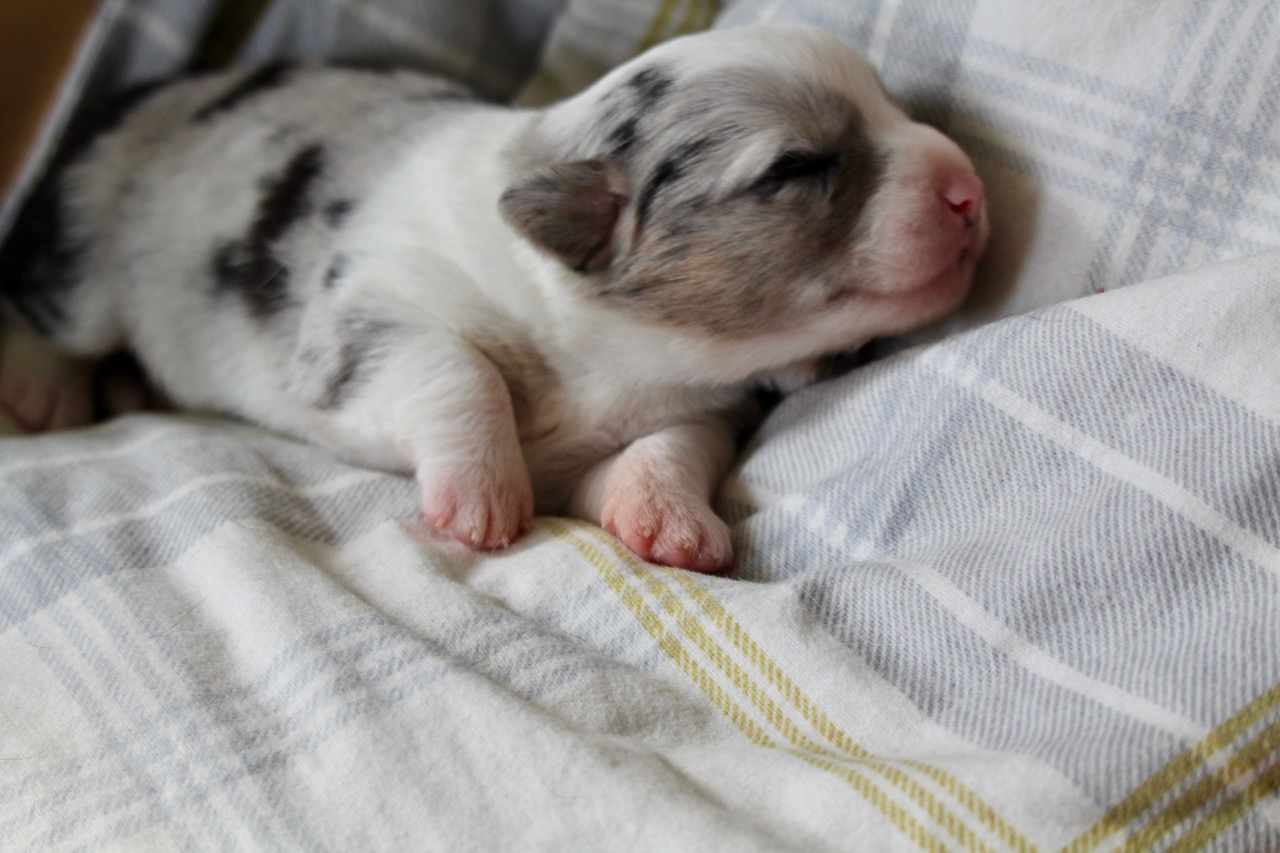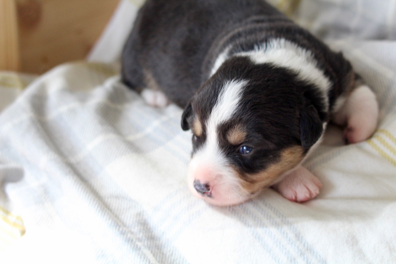 Als erster im Wurf hat dieser süße tricolour Rüde heute seine Augen geöffnet. |