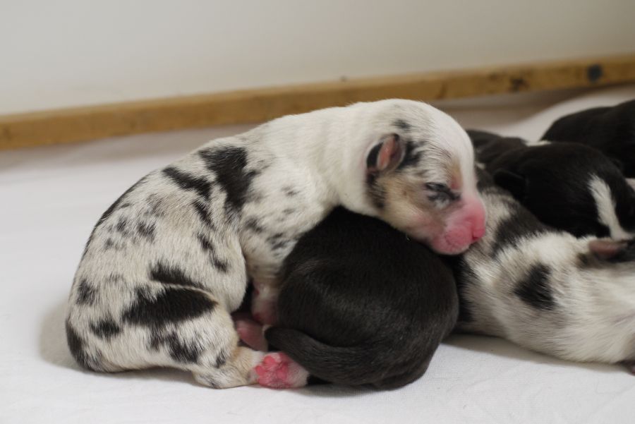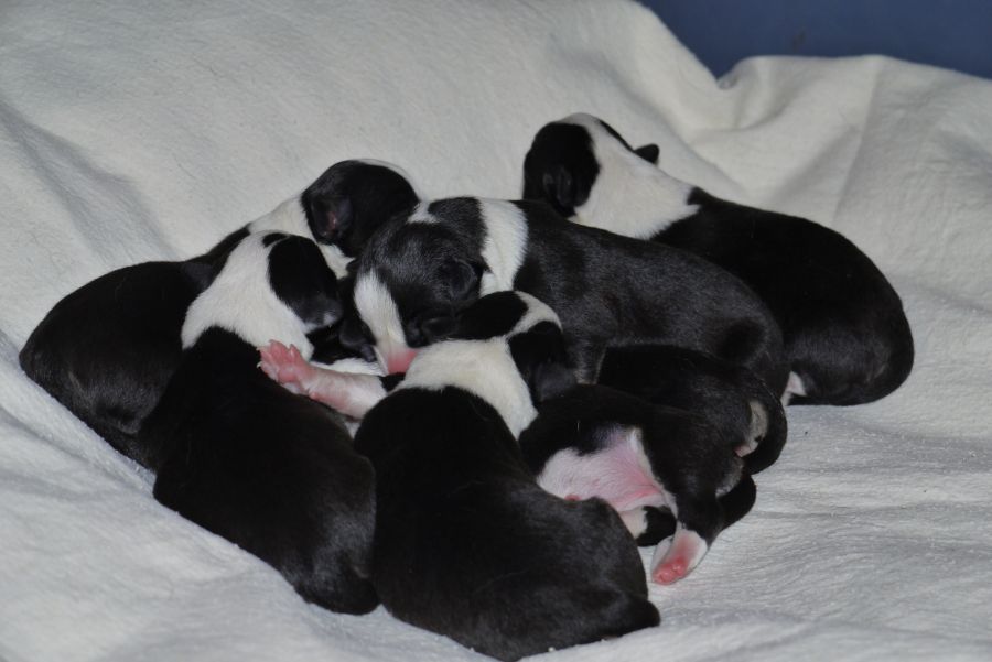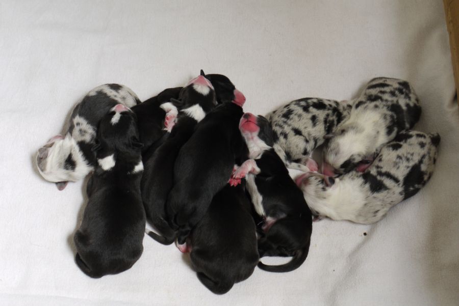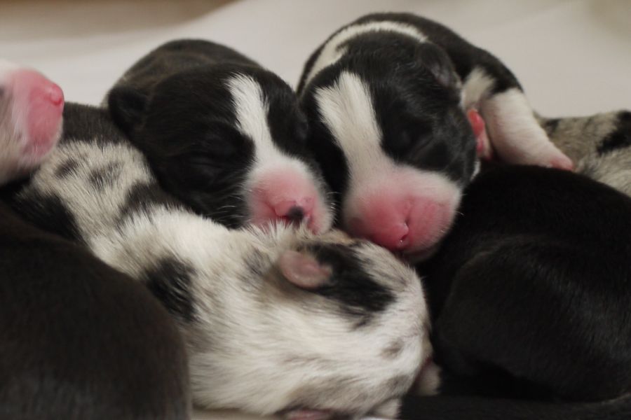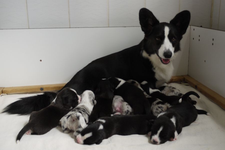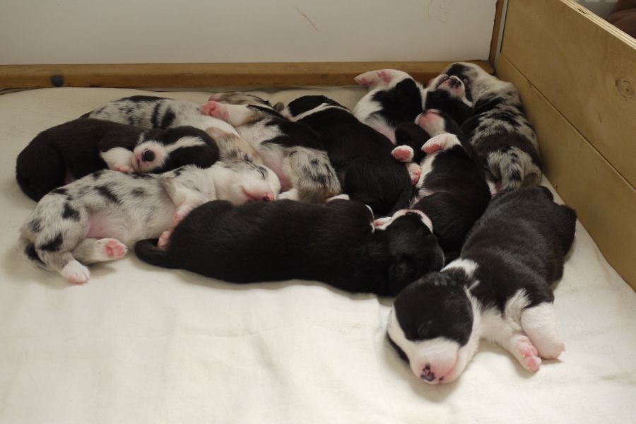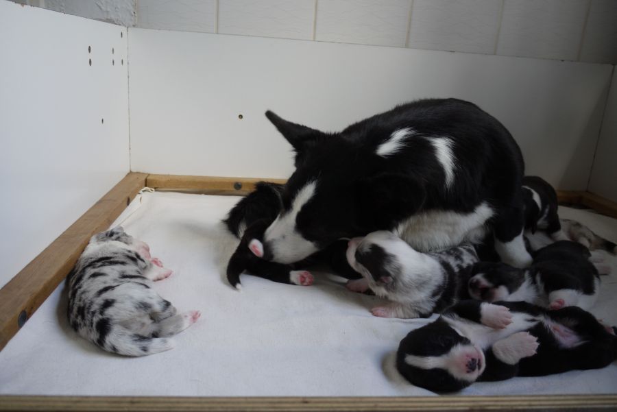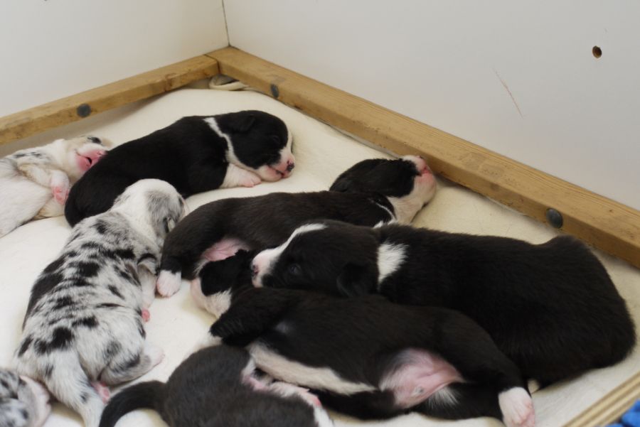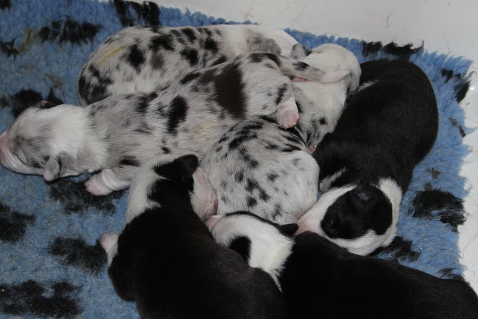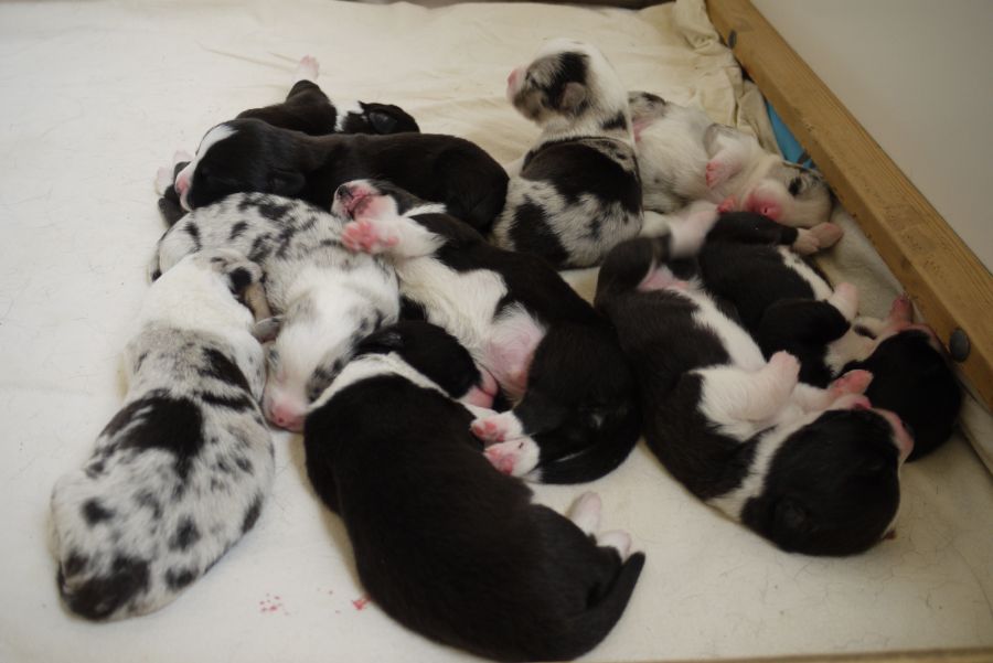 Wir sind glücklich und froh über unsere Hundefamilie. Am 12. September hat Inis ihre 10 (!!!) Welpen bekommen. Allesamt sind sie gesund und munter. Es sind 7 Rüden und 3 Hündinnen (5 bri.p.tricolour und 2 blue merle Rüden / 1 bri.p.tricolour und 2 blue merle Hündinnen). Das Geburtsgewicht ist gut und einheitlich, es liegt zwischen 274 g bis 306 g bei allen 10 Welpen. Inis geht es gut, sie versorgt ihre Welpen bestens.