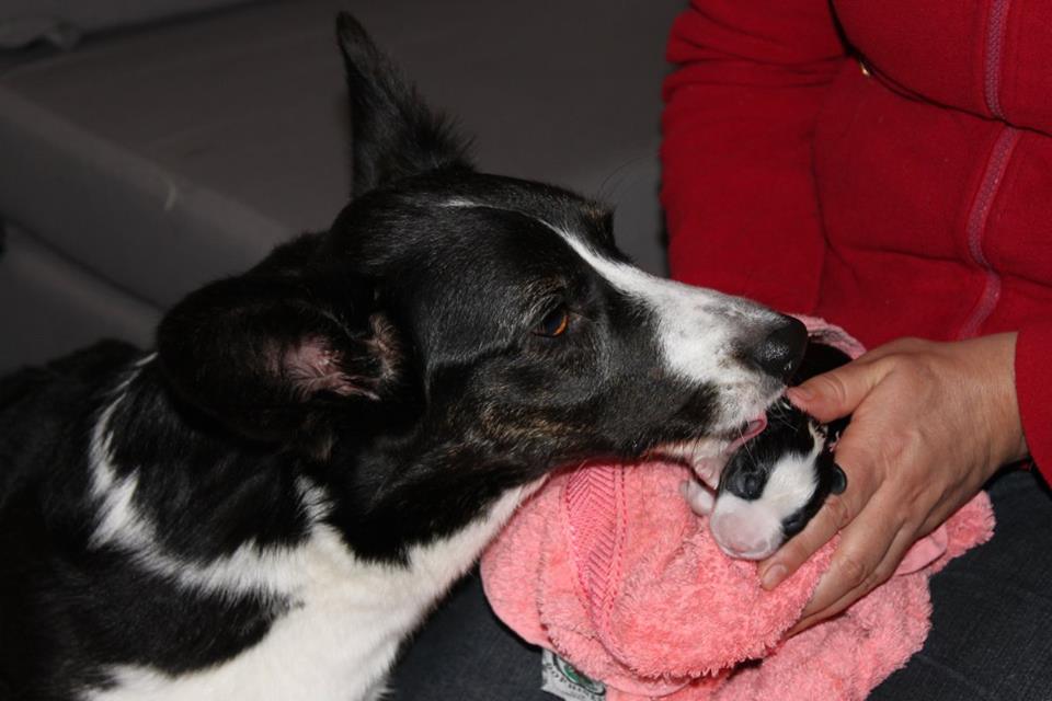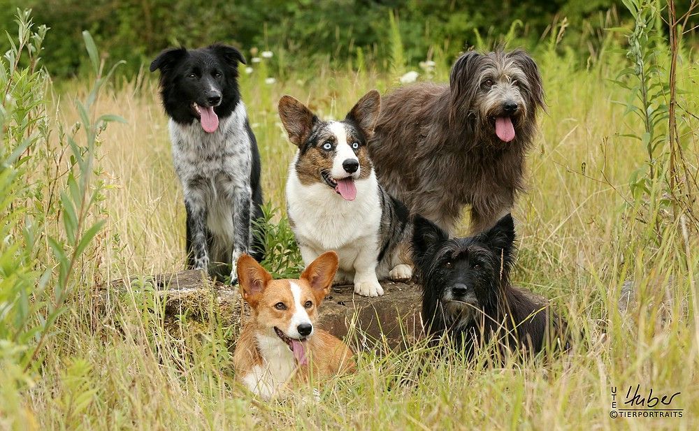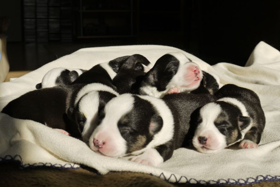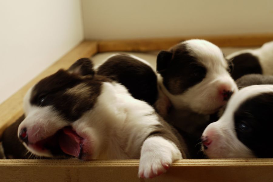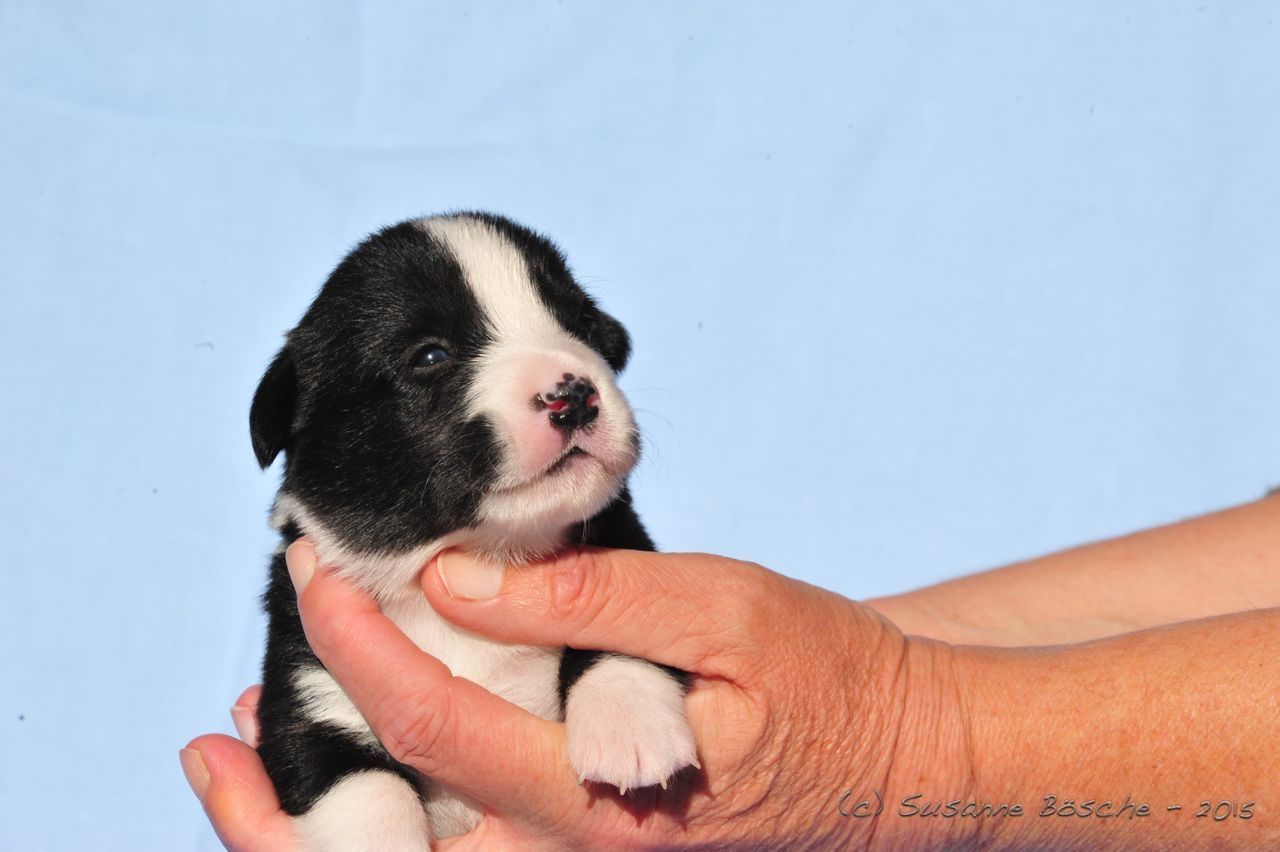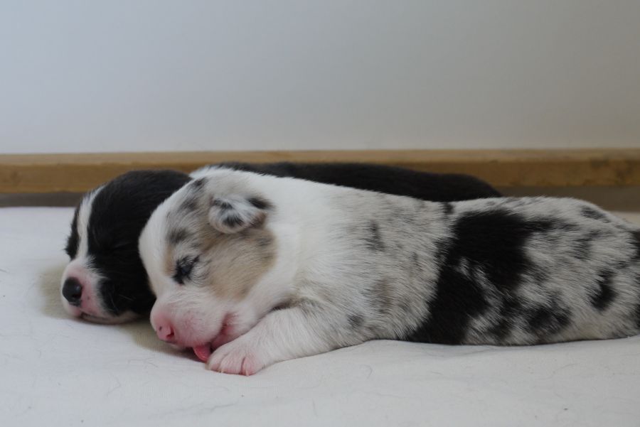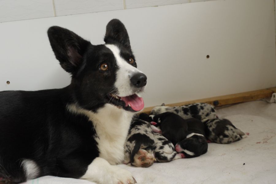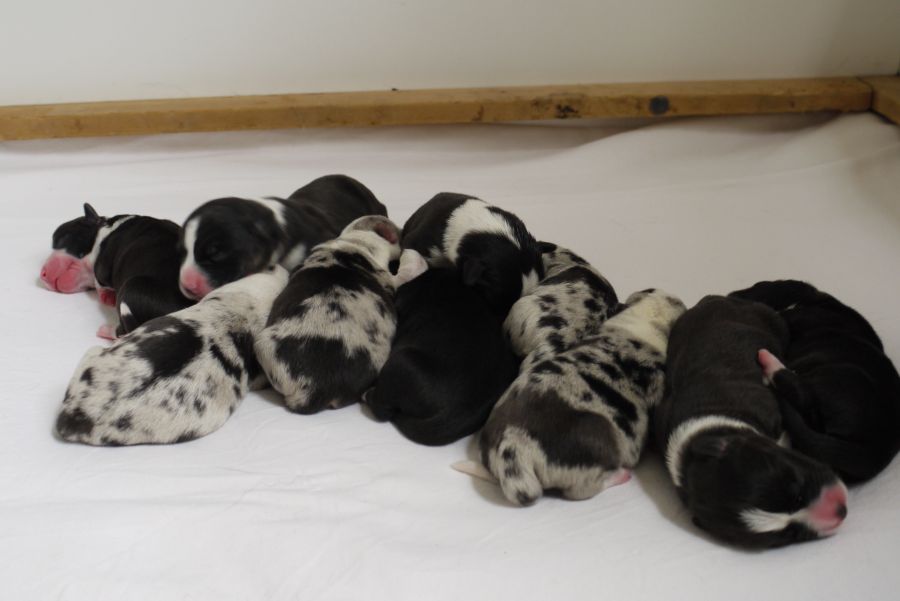 Wir sind glücklich und froh über unsere Hundefamilie. Am 12. September hat Inis ihre 10 (!!!) Welpen bekommen. Allesamt sind sie gesund und munter. Es sind 7 Rüden und 3 Hündinnen (5 bri.p.tricolour und 2 blue merle Rüden / 1 bri.p.tricolour und 2 blue merle Hündinnen). Das Geburtsgewicht ist gut und einheitlich, es liegt zwischen 274 g bis 306 g bei allen 10 Welpen. Inis geht es gut, sie versorgt ihre Welpen bestens.
