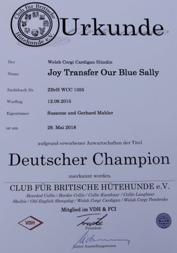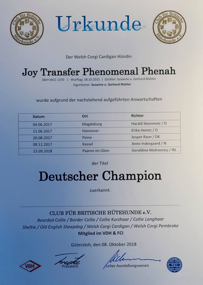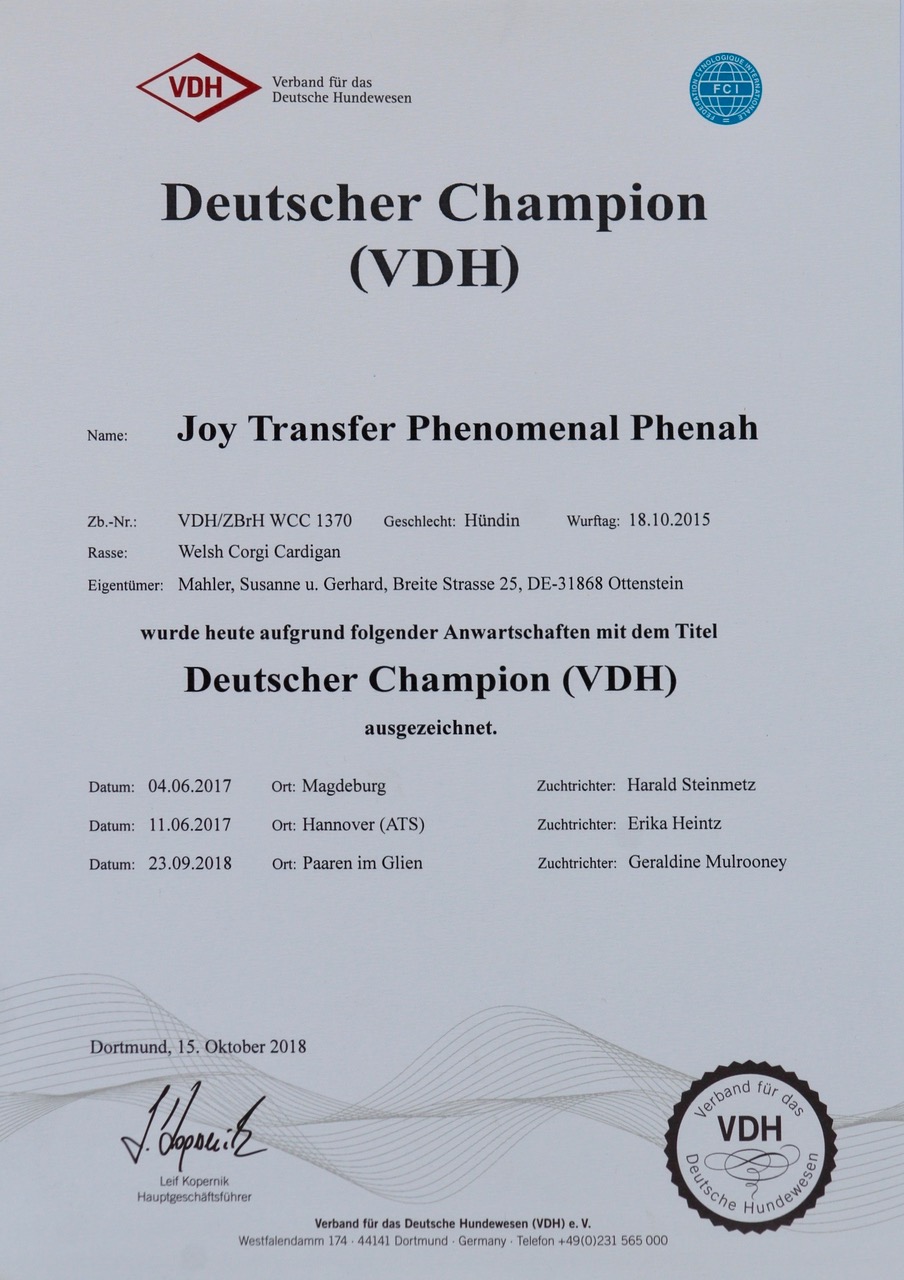 Unsere Feny hat inzwischen alle Bedingungen für die beiden Titel Dt. Champion VDH und Dt. Champion CfBrH erfüllt, und pünktlich zu ihrem 3. Geburtstag haben wir ihre Champion-Urkunden als schönes Geschenk erhalten. Nun ist Fenys offiezieller Name "Ch. Joy Transfer Phenomenal Phenah". Wir sind stolz auf unsere hübsche liebe Feny. |