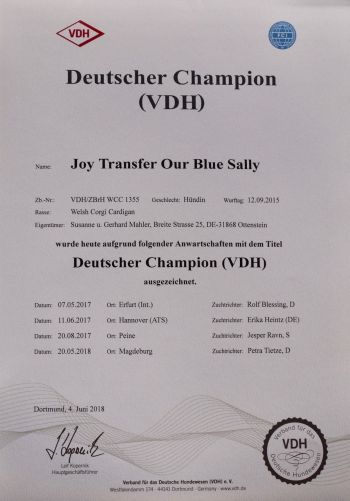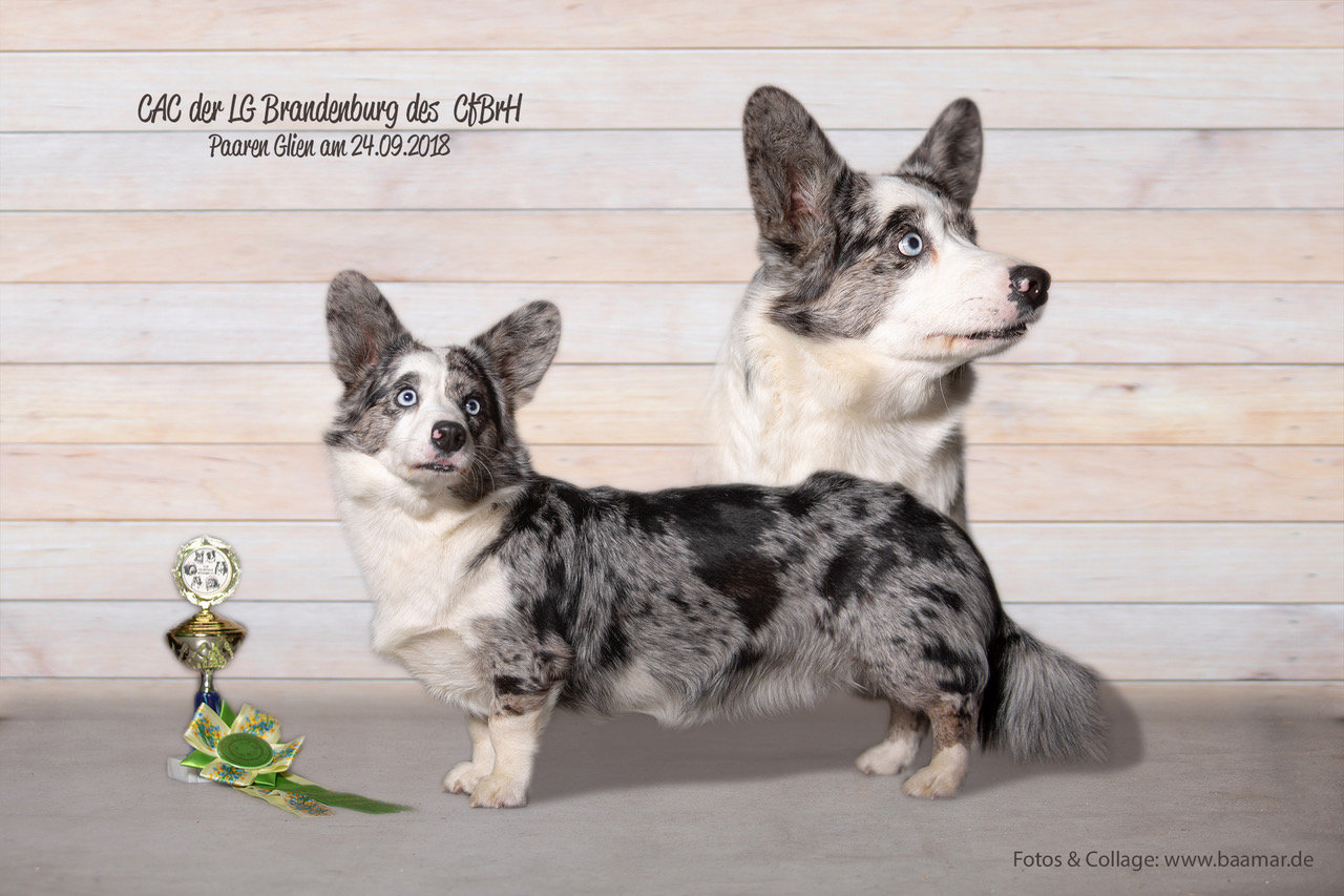 Sally (Joy Transfer Our Blue Sally) und Feny (Joy Transfer Phenomenal Phenah), unser Nachwuchs von 2015, war im Frühjahr 2017 soweit, dass wir mit dem Ausstellen in der Zwischen- und Offenen Klasse und dem Sammeln der Champion-Anwartschaften (CAC's) beginnen konnten. Nach Ablauf des "Wartejahres" im Frühjahr bzw. Frühsommer 2018 hoffen wir, die Dt. Champion-Titel für unsere beiden Mädels mit einem weiteren CAC vervollständigen zu können. |